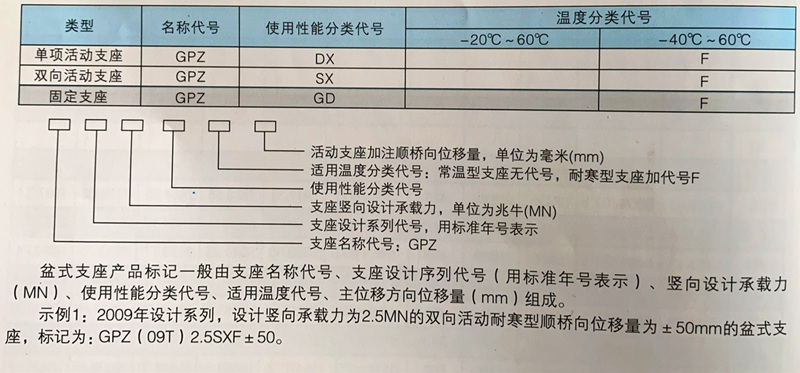本系列盆式支座為中華人民共和國交通行業(yè)標(biāo)準(zhǔn)《公路橋梁盆式支座》( JTT391-2009 )的通用設(shè)計, 系列通用設(shè)計圖名稱為公路橋梁盆式支座系列通用圖,系列 通用圖代號為GPZ (09T)0.4-60(DX、SX、 GD),系列支座型號為GPZ